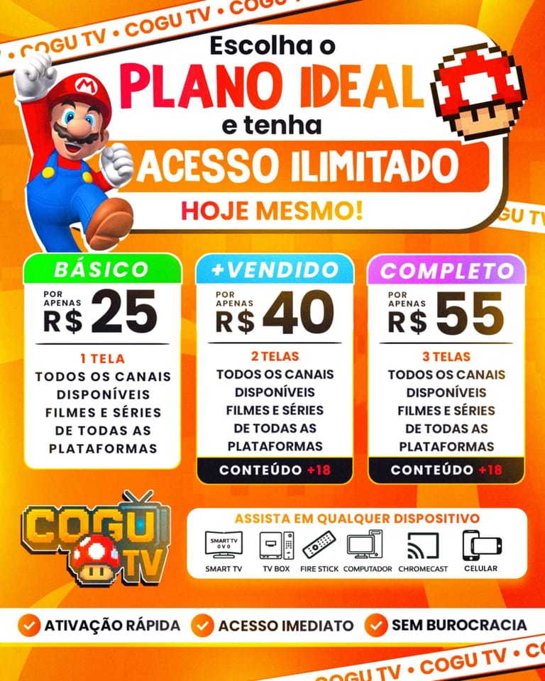 ✔ Compatível com Smart TV, TV Box, celular e computador